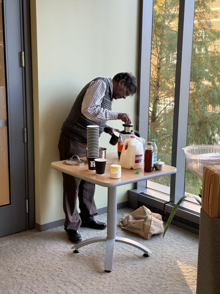 Main Content Prof. Isaac Vellangany prepares tea at the Student Wellness Collaborative pumpkin carving event on Halloween. Prof. Vellangany introduces students to tea ceremonies to build social wellness and cultural awareness.